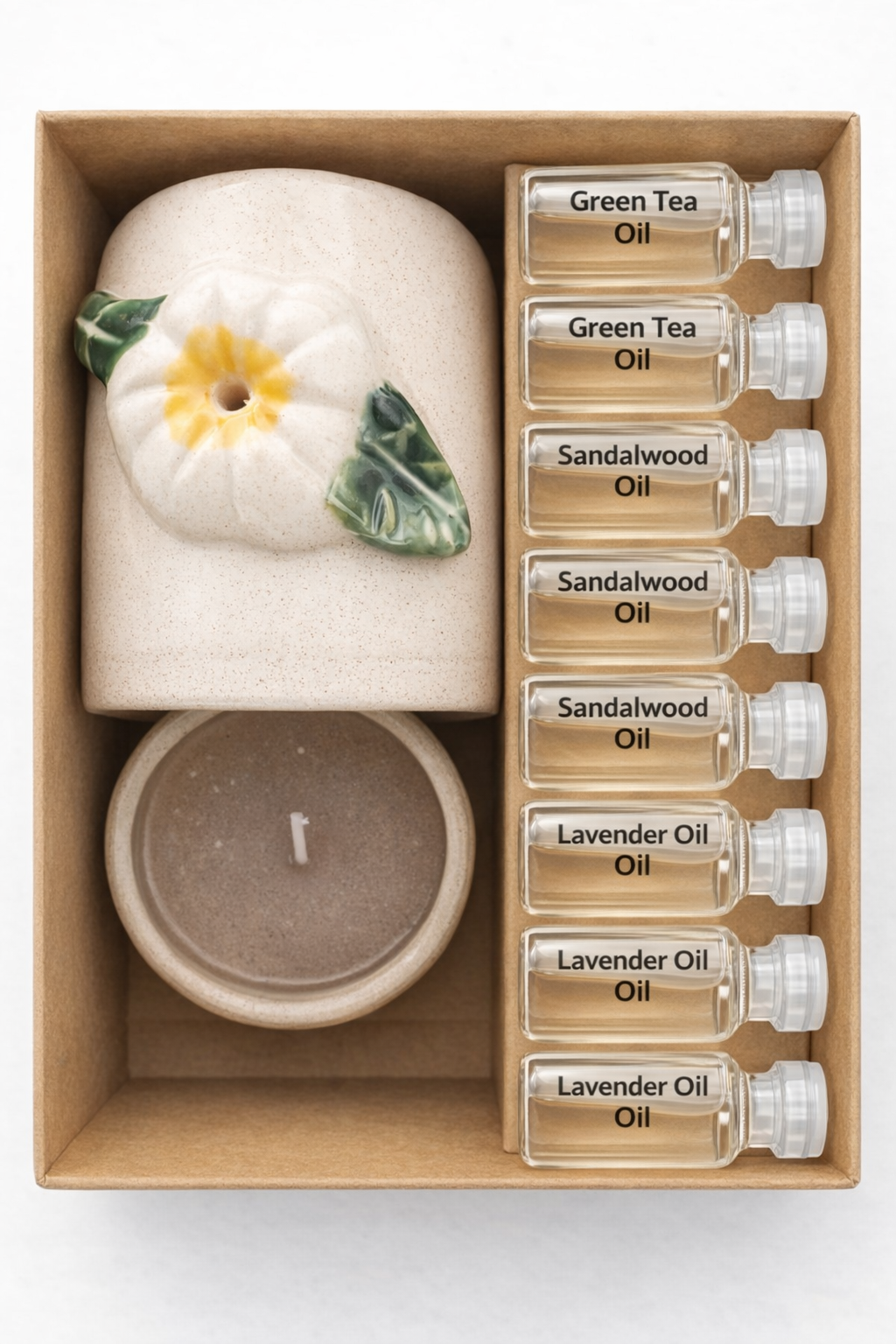 This aromatherapy gift set includes a ceramic oil burner, tea light candle, and seven miniature bottles of fragrance oil for creating a relaxing, spa-like atmosphere at home.